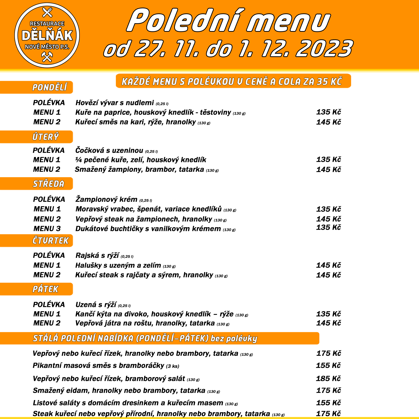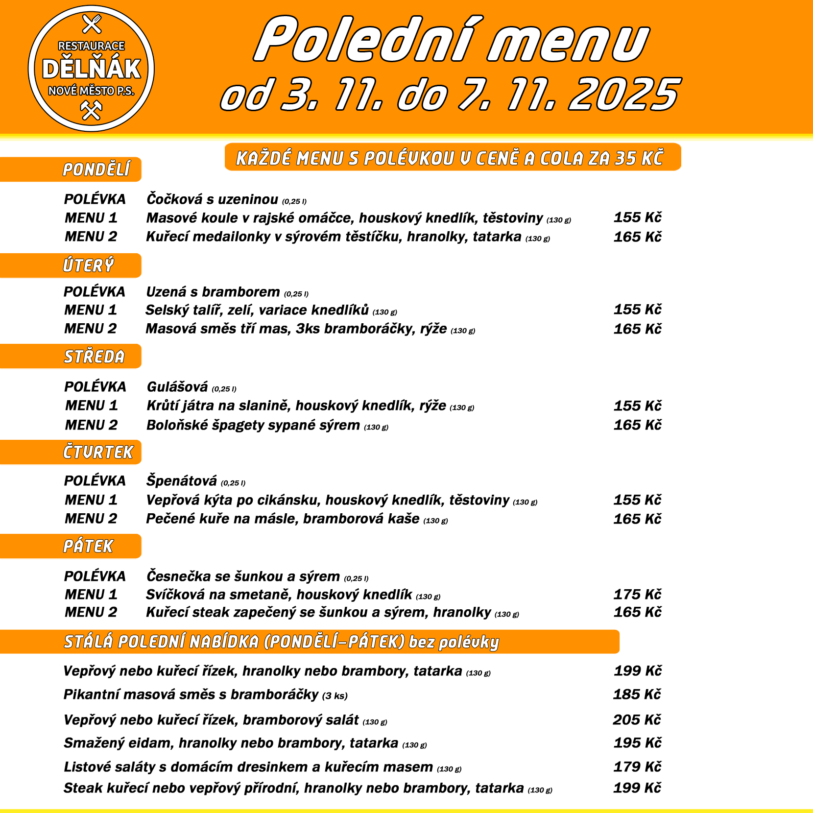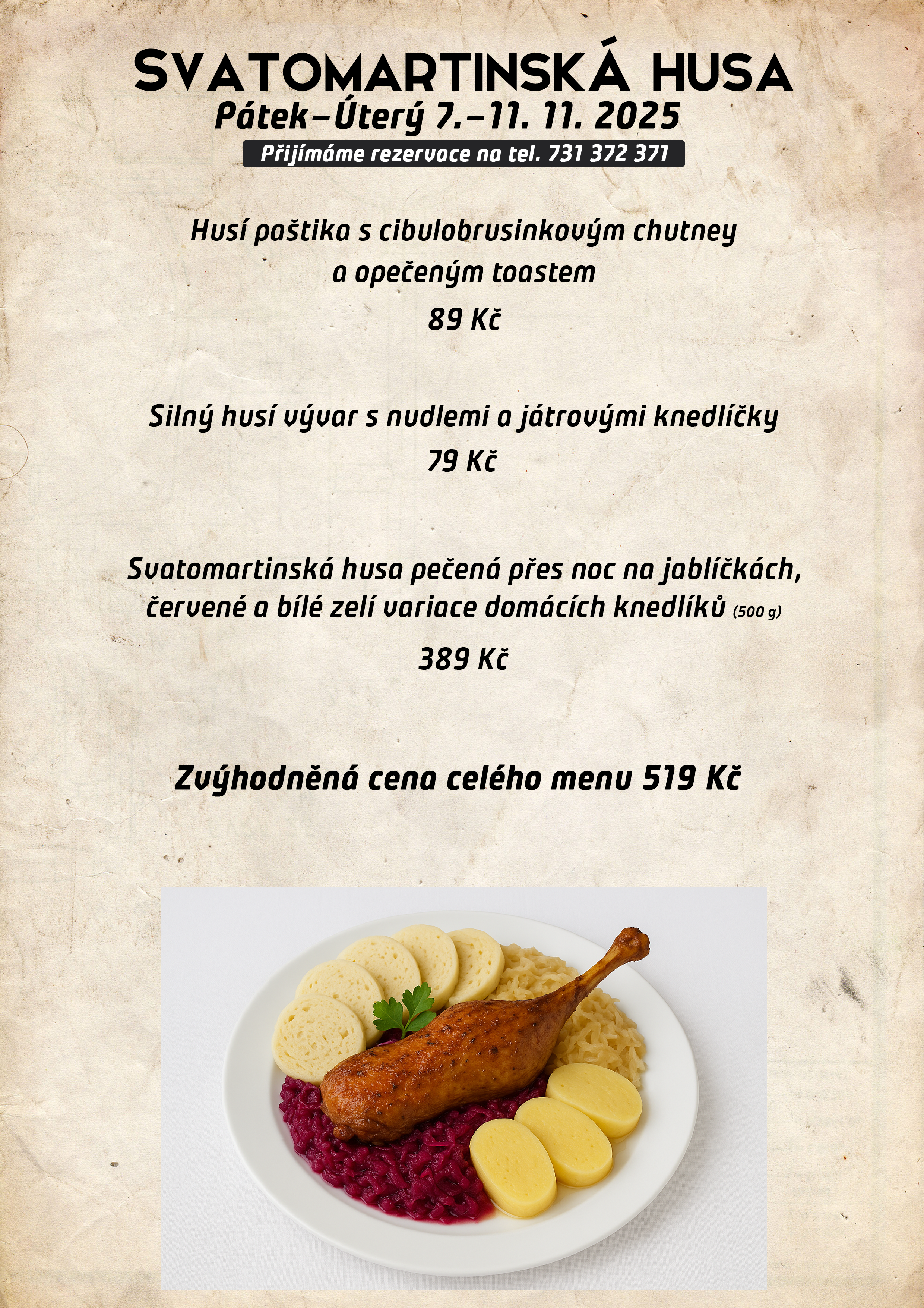 Aktuálně z naší restaurace Jídelní lístky, pozvánky na akce a další informace… Nabídka platí od 24. 10. 15:00 hod. do 26. 10. 2025 19:00 hod.